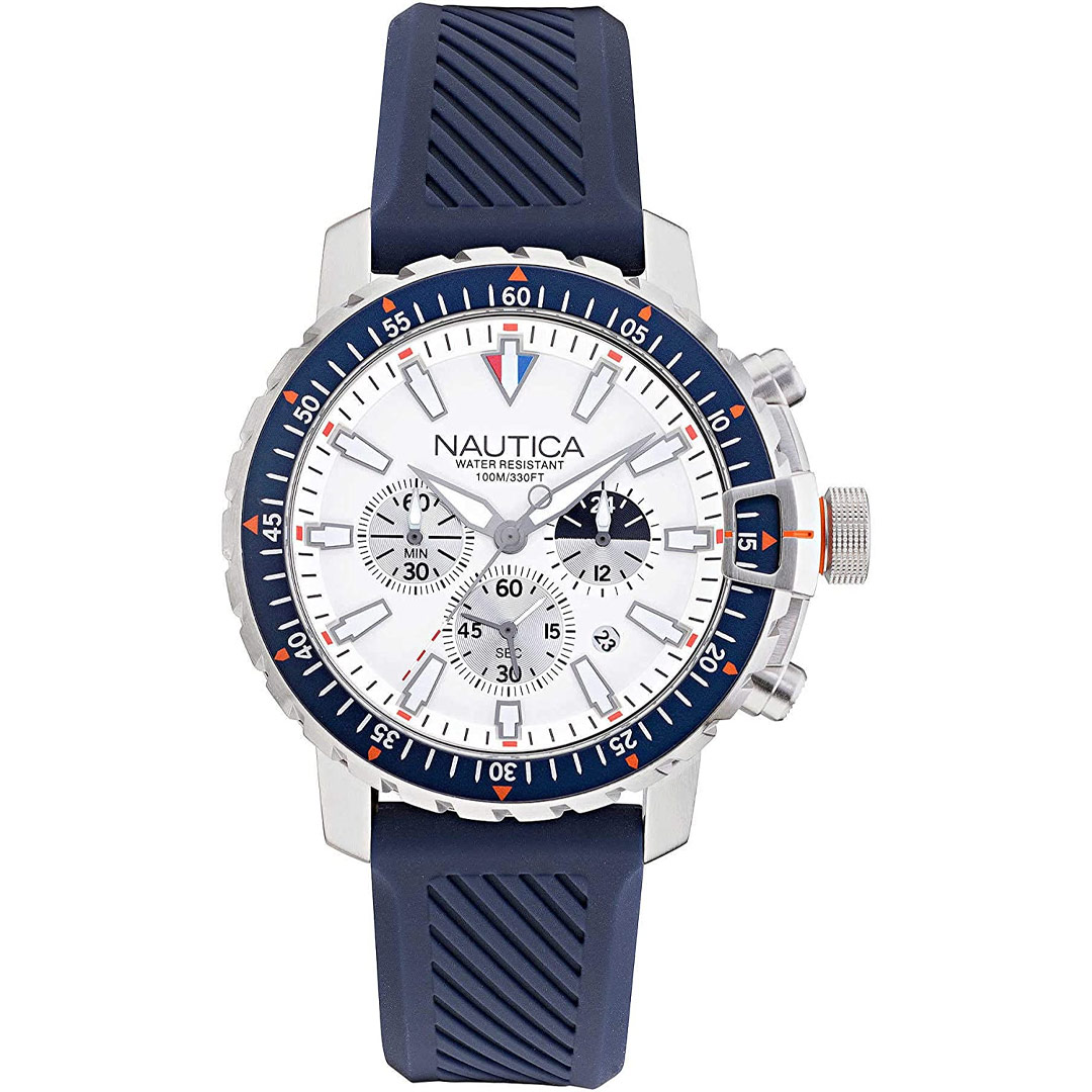Sportski sat upečatljivog izgleda. Analogni model koji ima mineralno staklo, kućište prečnika 45mm i silikonsku narukvicu teget boje. Brojčanik je bijele boje i sadrži hronograf i datumski prikaz. Pojedini podioci na satu su ukrašeni simbolima pomorskih zastavica. Ovaj Nautica model sadrži krunicu sa šrafom, a njegova vodootpornost je do 10ATM. Sat dolazi u originalnom fabričkom pakovanju sa kutijom, certifikatima i međunarodnom garancijom, a ovaj model je dio kolekcije ICEBREAKER.