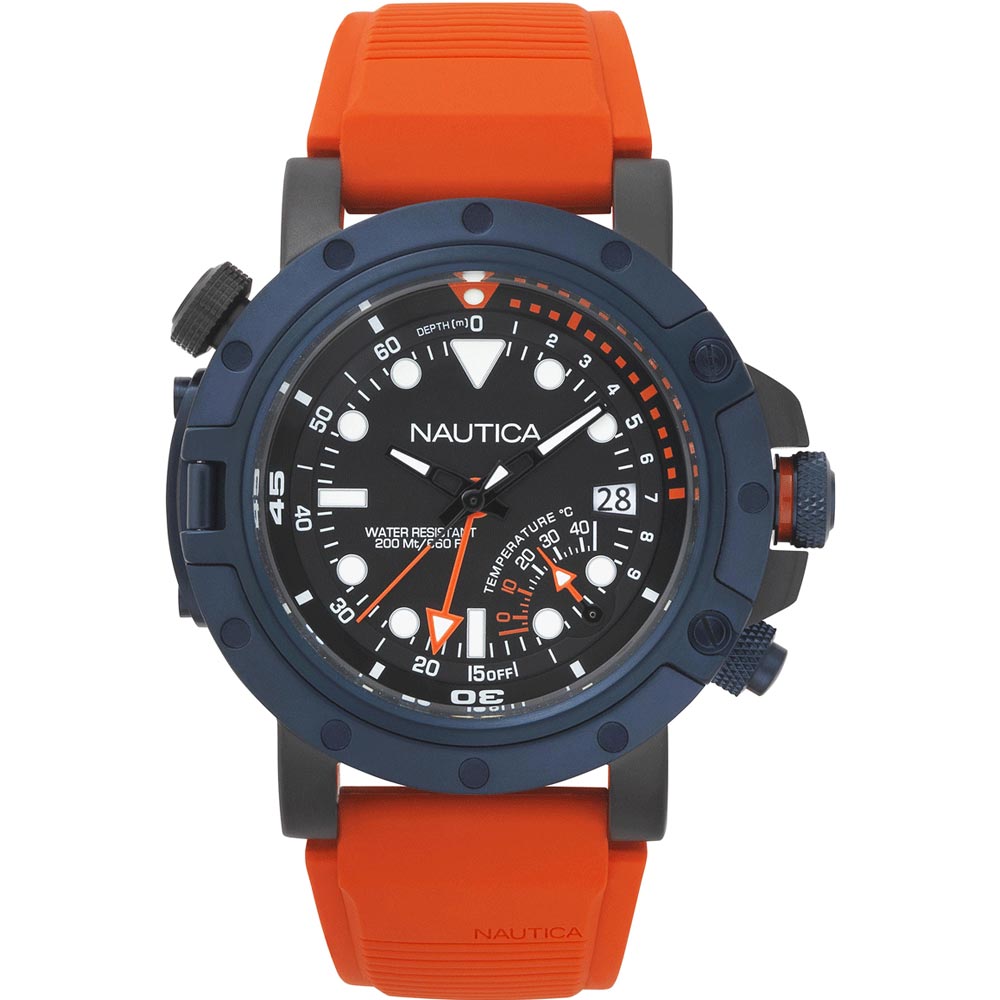 Masivni multifunkcionalni sat koji odiše sportskim duhom. Analogni model koji pokreće japanski ronilački mehanizam. Narukvica na ovom satu je od silikona i narandžaste je boje, a samo staklo je od mineralnog kristala. Kružni brojčanik crne je boje. Od funkcija posjeduje termometar i dubinometar. Idealan izbor za sve koji vole ronjenje, kao i ostale vodene aktivnosti. Ovaj Nautica model sadrži krunicu sa šrafom, a njegova vodootpornost je do 20ATM. Sat dolazi u originalnom fabričkom pakovanju sa kutijom, certifikatima i međunarodnom garancijom, a ovaj model je dio kolekcije PORTHOLE DIVE.